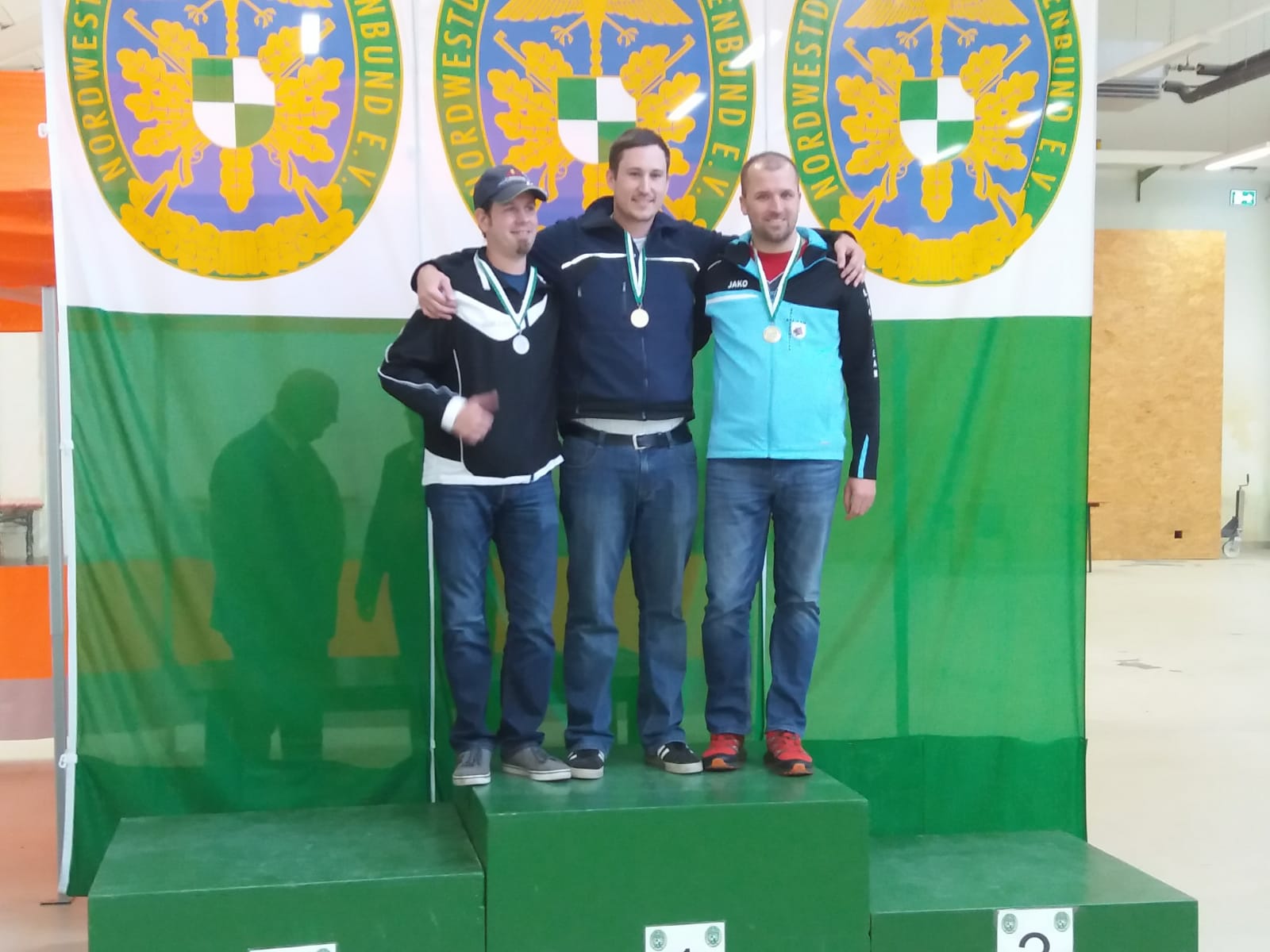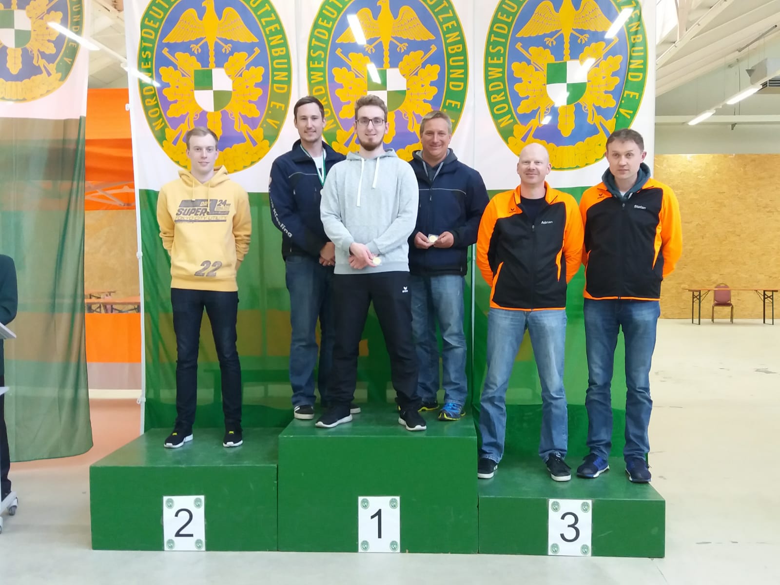 Alle drei Mannschaften des SV Neuenlandermoor auf dem Podium. Neuenlandermoor I errang mit den Schützen Klaus Denks (385 Ringe), Alexander Bederke (385 Ringe) und Marcel Handrick (382 Ringe) den 1. Platz mit insgesamt 1152 Ringen vor Neuenlandermoor II mit insgesamt 1112 Ringen und den Schützen Sven Krüer (356 Ringe), Sabrina Warnke (382 Ringe) und Natalie Holst (374 Ringe). Den 3. Platz belegte schließlich die 3. Mannschaft des SV Neuenlandermoor mit 1050 Ringen, bestehend aus den Schützen Fenja Oldenborg (360 Ringe), Sabrina Seebeck (356 Ringe) und Corinna Steinkamp (334 Ringe).
