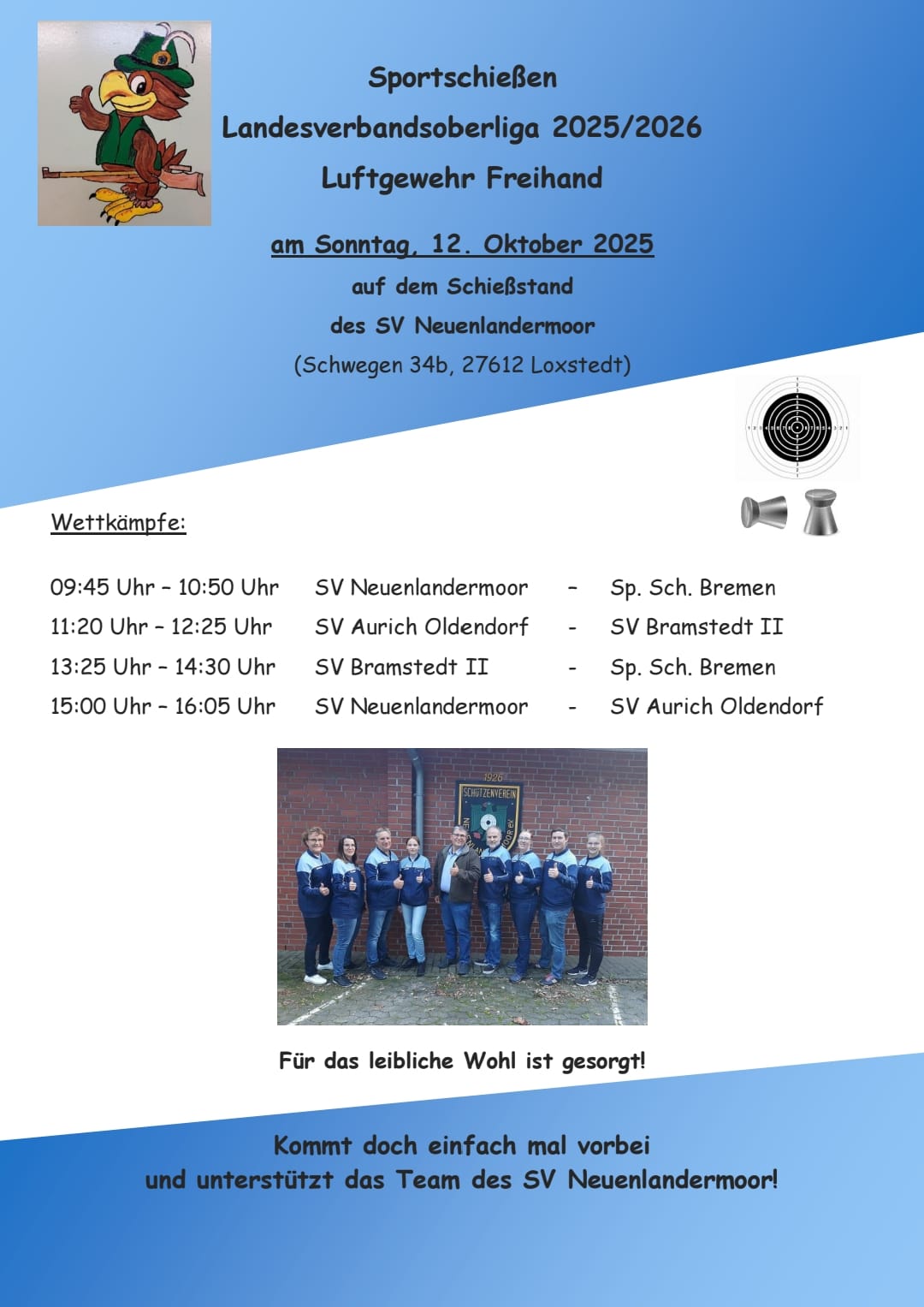 27.09.2025: Link: Vorankündigung (Landesoberligawettkampf am 12.Oktober 2025 in der Schützenhalle mit der 1. Mannschaft des SV Neuenlandermoor)