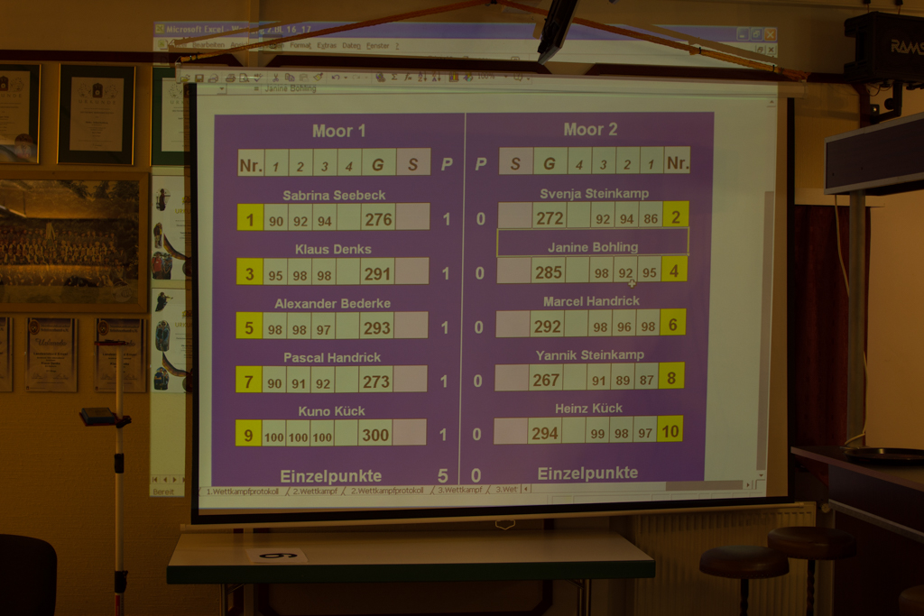 Ob Luftgewehr mit Auflage oder freihändig, Luftpistole oder mehrschüssige Luftpistole, alles was im Verein im Bereich der Luftdruckwaffen geschossen wird, wurde von Udo Seedorf vorgestellt und kommentiert.  Ein Showkampf zwischen zwei Mannschaften des SV Neuenlandermoor, jeweils aus verschiedenen Disziplinen zusammengesetzt, zeigte wieder einmal die Leistungsstärke und das hohe Niveau, das unsere Schützen immer wieder abrufen und auch unter Stress  unter Beweis stellen können. Aber es sind schließlich auch Schützen angetreten, die z.B. wie Marcel Handrick und Klaus Denks in Armbrust-Disziplinen unlängst an Ausscheidungsschießen zur Deutschen Nationalmannschaft teilgenommen haben, wobei Marcel Handrick es schließlich geschafft hat und künftig nicht nur für den SV Neuenlandermoor, sondern auch für Deutschland schießt. Auch war z.B. mit Alexander Bederke ein Juniorenweltmeister mit etlichen sonstigen Erfolgen dabei (siehe auf unserer Internetseite unter "unsere Sportler"). Erstaunliche Ergebnisse erzielten aber auch z.B. unsere "alten Hasen" wie die Gebrüder Heinz und Kuno Kück. Heinz als Gegenkanditat von Kuno war unter "Insidern" eigentlich als Favorit ins Rennen gegangen, aber Kuno schoss in der Auflage-Disziplin von 300 möglichen Ringen 300 Ringe. Heinz musste sich diesmal knapp geschlagen geben. Insgesamt ging das Rennen für "Moor 1" gegen "Moor 2" mit 5:0 aus.